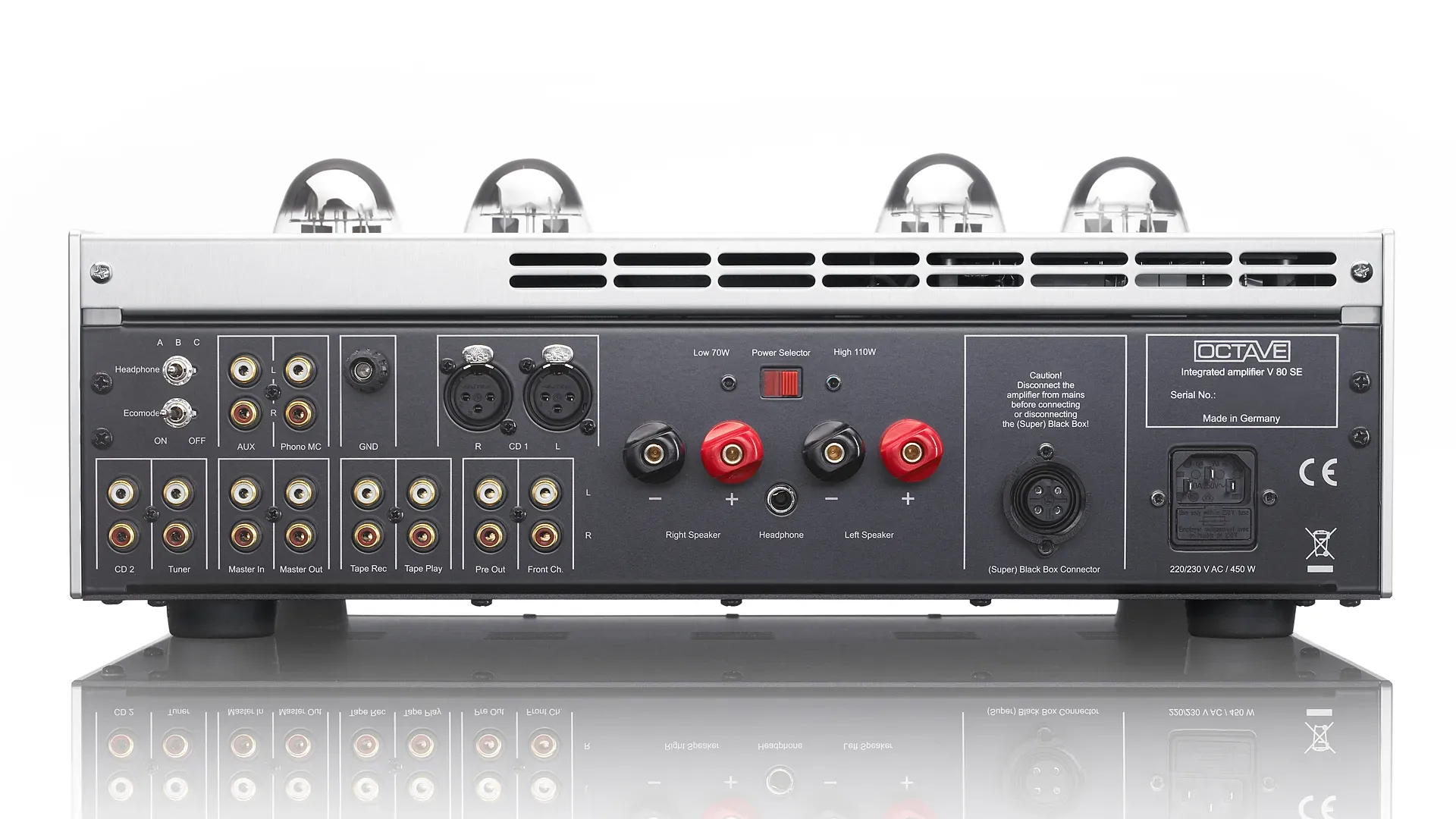 Naturalmente, il V 80 SE è dotato della gestione dell’alimentazione tipica di Octave con elettronica Soft-Start, sistema di protezione, selettore di potenza, modalità Eco, impostazione e visualizzazione BIAS, uscita Monitor/Record, bypass HT, uscita Pre, uscita cuffie e connessione (Super) Black Box.
